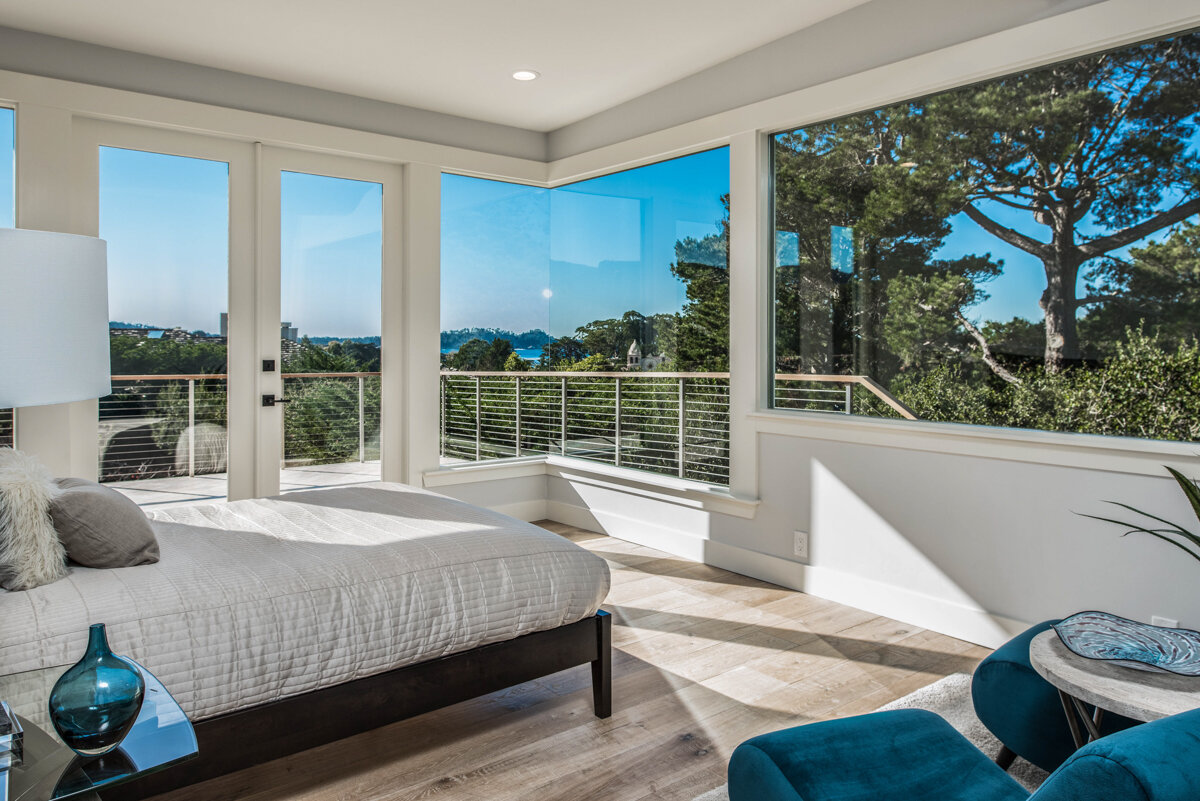 At the heart of the house, the open kitchen is faced with travertine stone walls relieved by expansive corner windows, which meet seamlessly to offer an unobstructed view of Point Lobos, Carmel Mission and the sea. The accent wall in the living room, also in travertine, creates consistency. Outside, a travertine path, flanked by stone planters, is sheltered by a modern portico, as it rolls smoothly to the front door, whose horizontal glass panes are framed in cobalt blue mahogany. This was never meant to be a classic Carmel cottage.